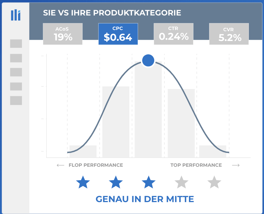 Wie gut ist Ihr(e) ACoS CPC im Vergleich zum Wettbewerb? Finden Sie es jetzt heraus! Vergleichen Sie Ihre Amazon Advertising-Performance mit Wettbewerbern in Ihrer spezifischen Produktkategorie.